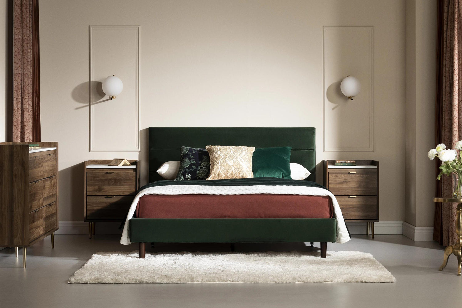 La tendance Mid-Century Glam est le résultat d’une alliance entre le chic hollywoodien décadent aux accents métalliques et le style d’après-guerre plutôt rétro mettant de l’avant des formes géométriques et des tons chauds vibrants. Les textures variées, le piètement en angle et le doré priment.
