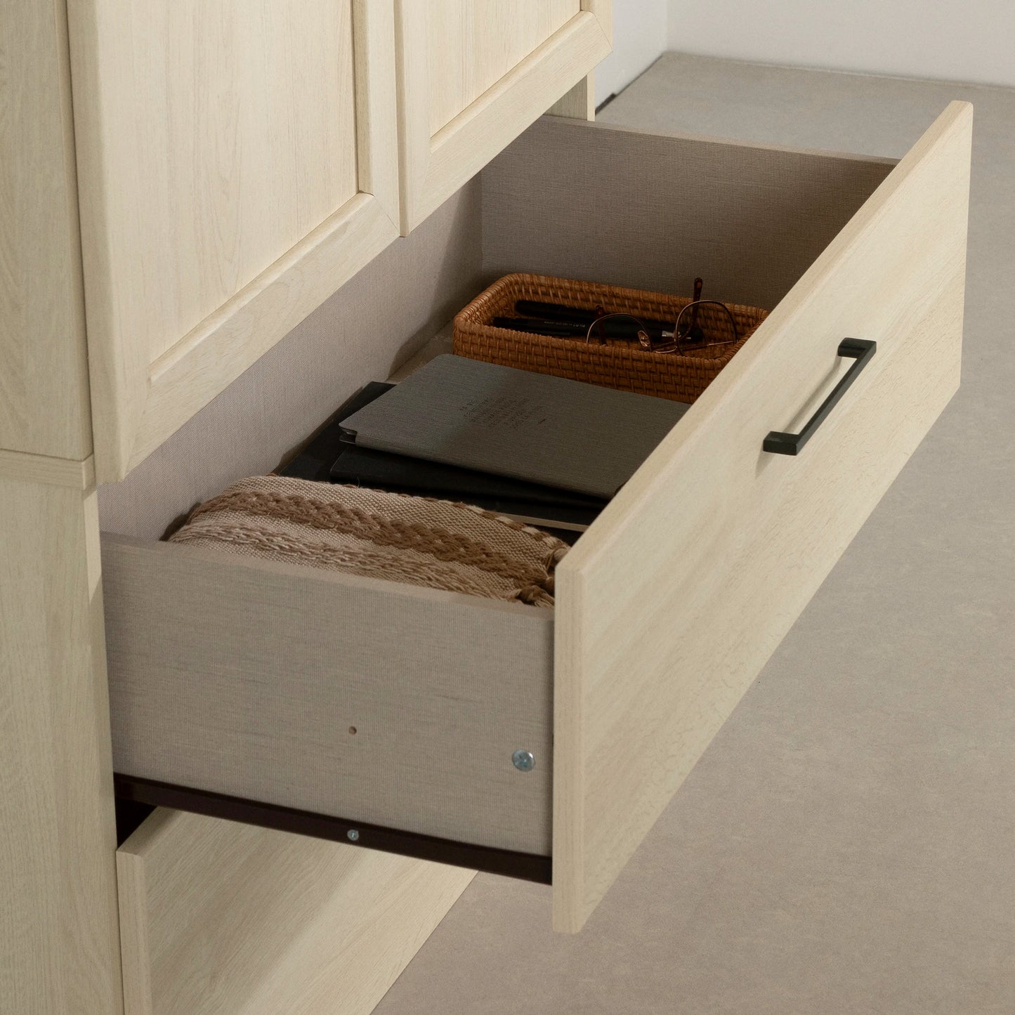 • GLISSIÈRES DE MÉTAL : les tiroirs, spacieux et faciles à manier, glissent sans effort grâce à des coulisses de métal robustes.
