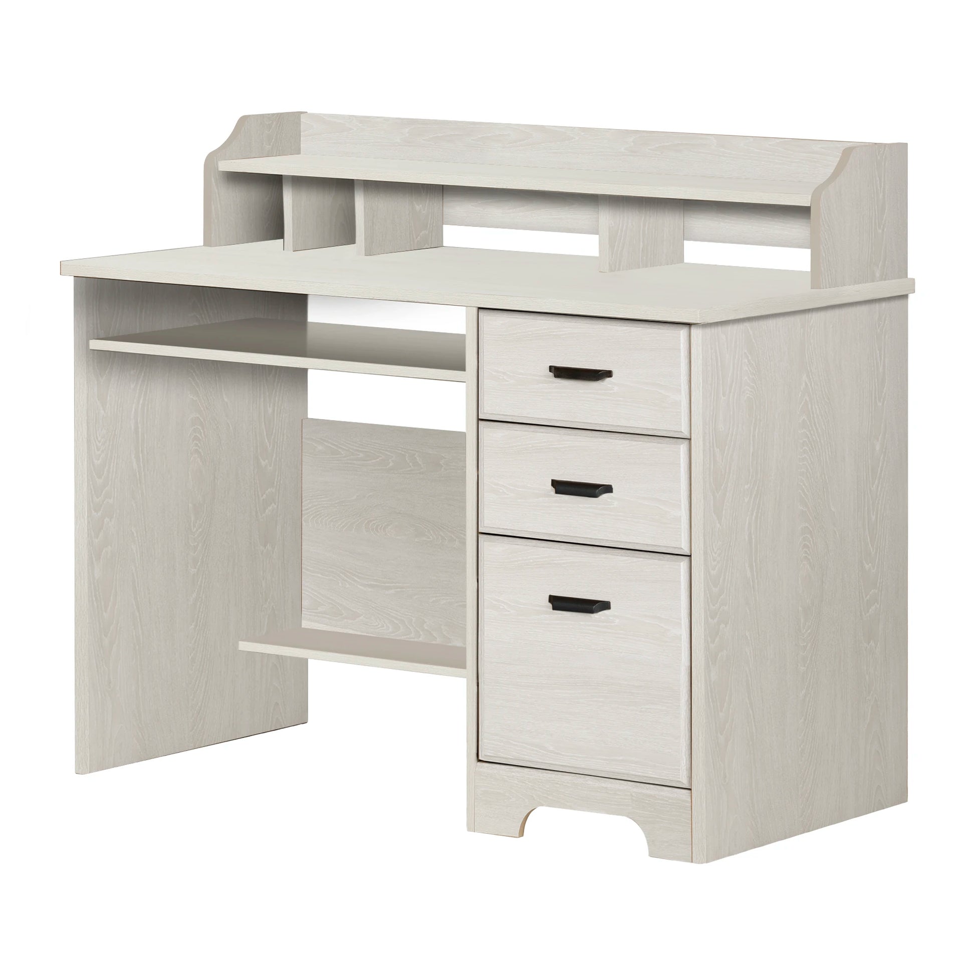 Pour un espace de travail organisé, classez vos articles de bureau dans les 2 tiroirs du haut et suspendez vos chemises de classement dans celui du bas. Les 3 tiroirs sont de différentes hauteurs pour répondre aux dimensions de plusieurs articles. La petite tablette fixe sous la surface de travail sert de rangement pour le portable lorsqu’il n’est pas utilisé. L’autre tablette située aux pieds est destinée à supporter des livres plus rarement utilisés.