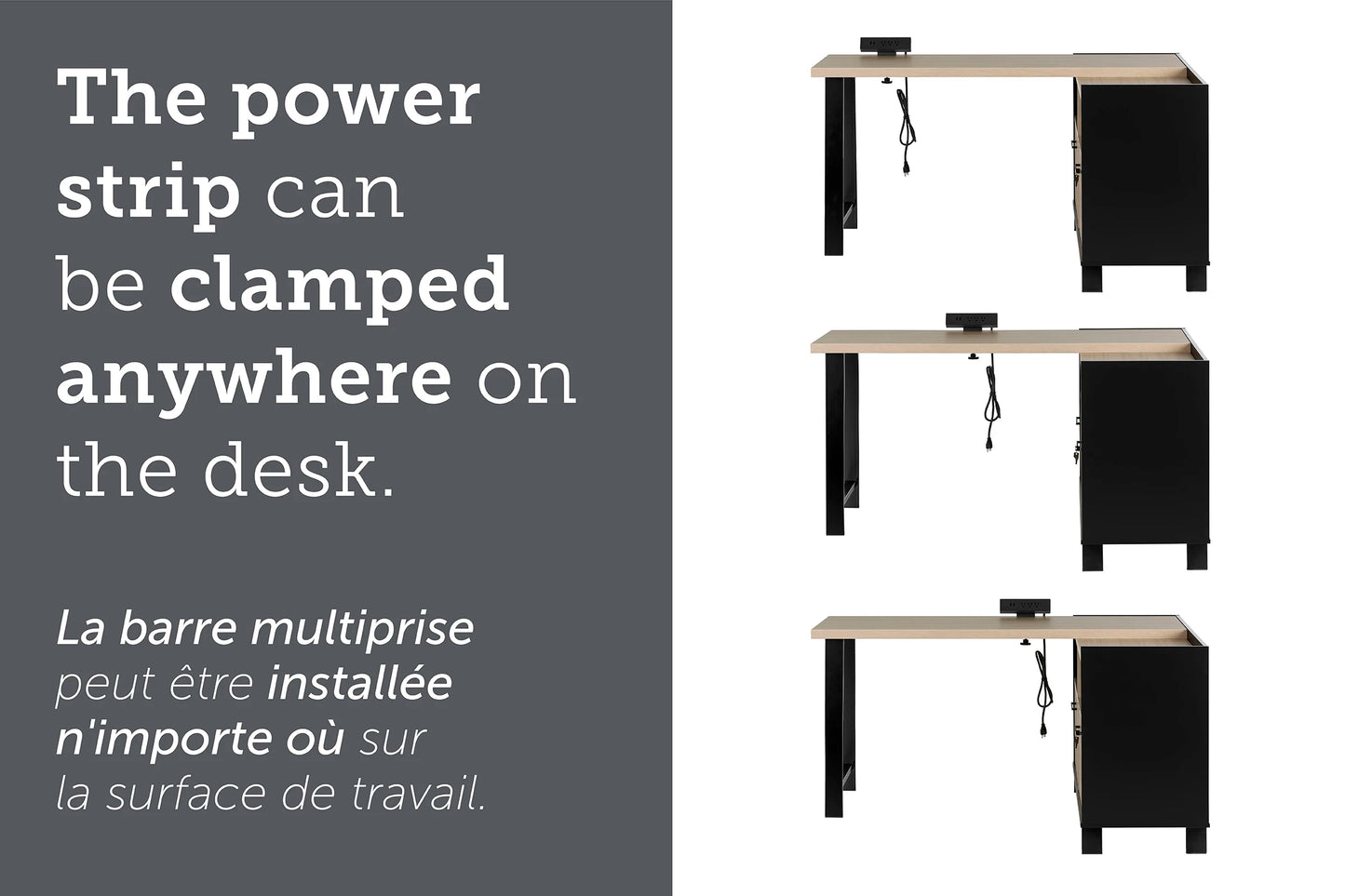 • MULTIPRISE SUR PINCE: afin d’être bien organisé et d'avoir tout à portée de la main, ce bureau possède une barre d’alimentation avec trois prises régulières et deux USB. Vous pouvez facilement la déplacer sur la surface du bureau comme elle est sur une pince.