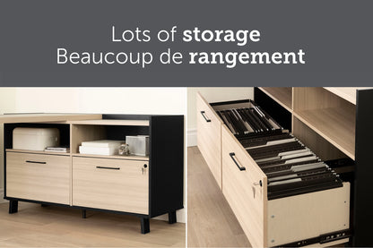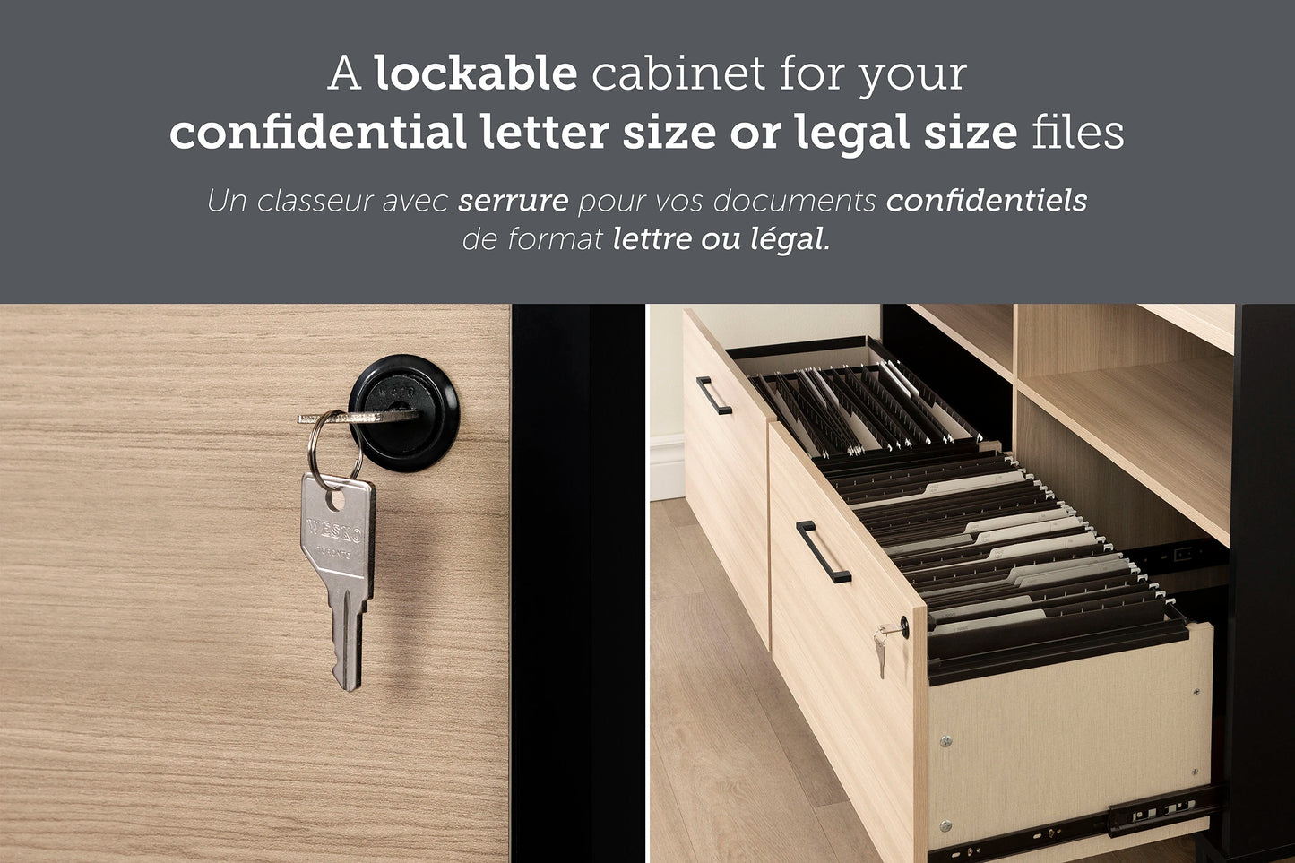 En plus d’avoir une grande surface, ce poste de travail comprend aussi plusieurs espaces de rangement! Il possède deux grands tiroirs classeurs pour organiser vos feuilles 8½”x11” ou 8½”x14”, et l’un d’eux se verrouille à clé pour une sécurité maximale. Ce qui est merveilleux, c’est que c’est vous qui choisissez lequel! Vous avez aussi facilement accès à deux espaces ouverts, ce qui vous permet de garder vos livres, cartables et feuilles à portée de main. Vous n’aurez même pas besoin de bouger de votre chaise!
