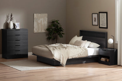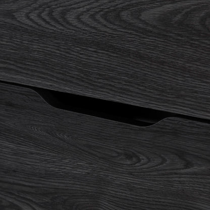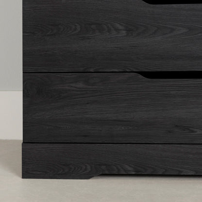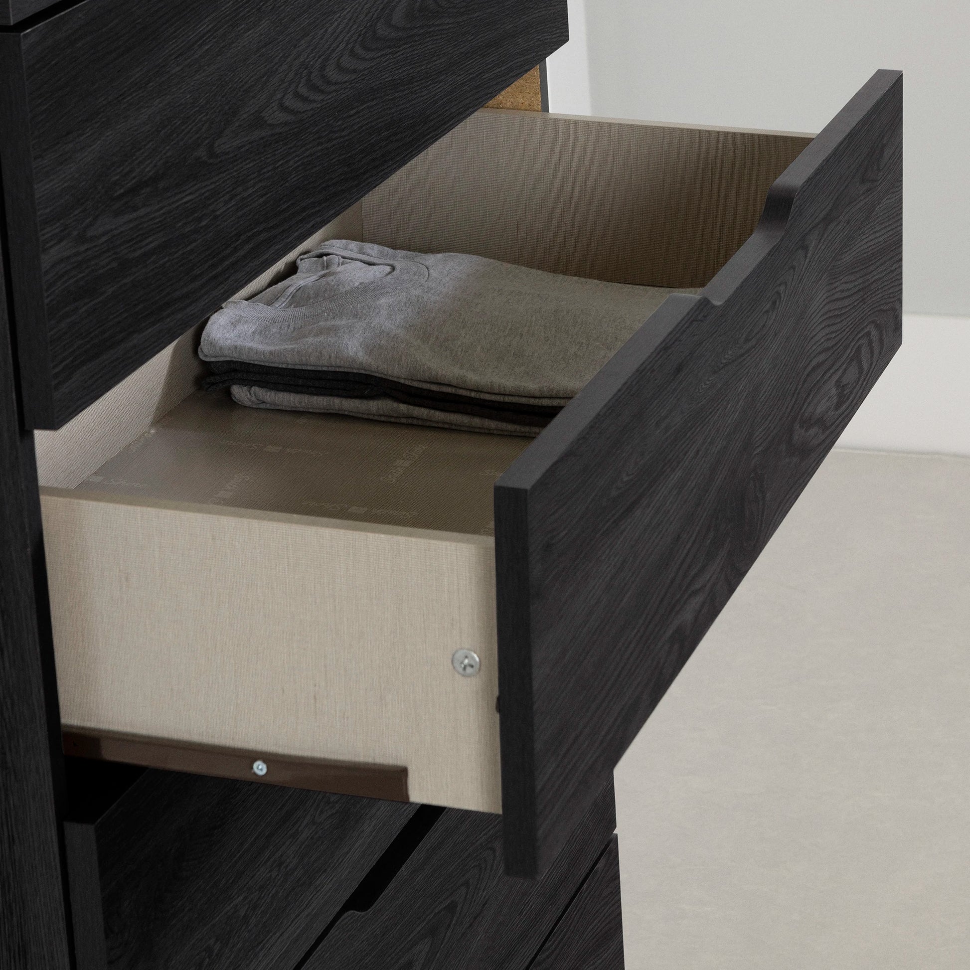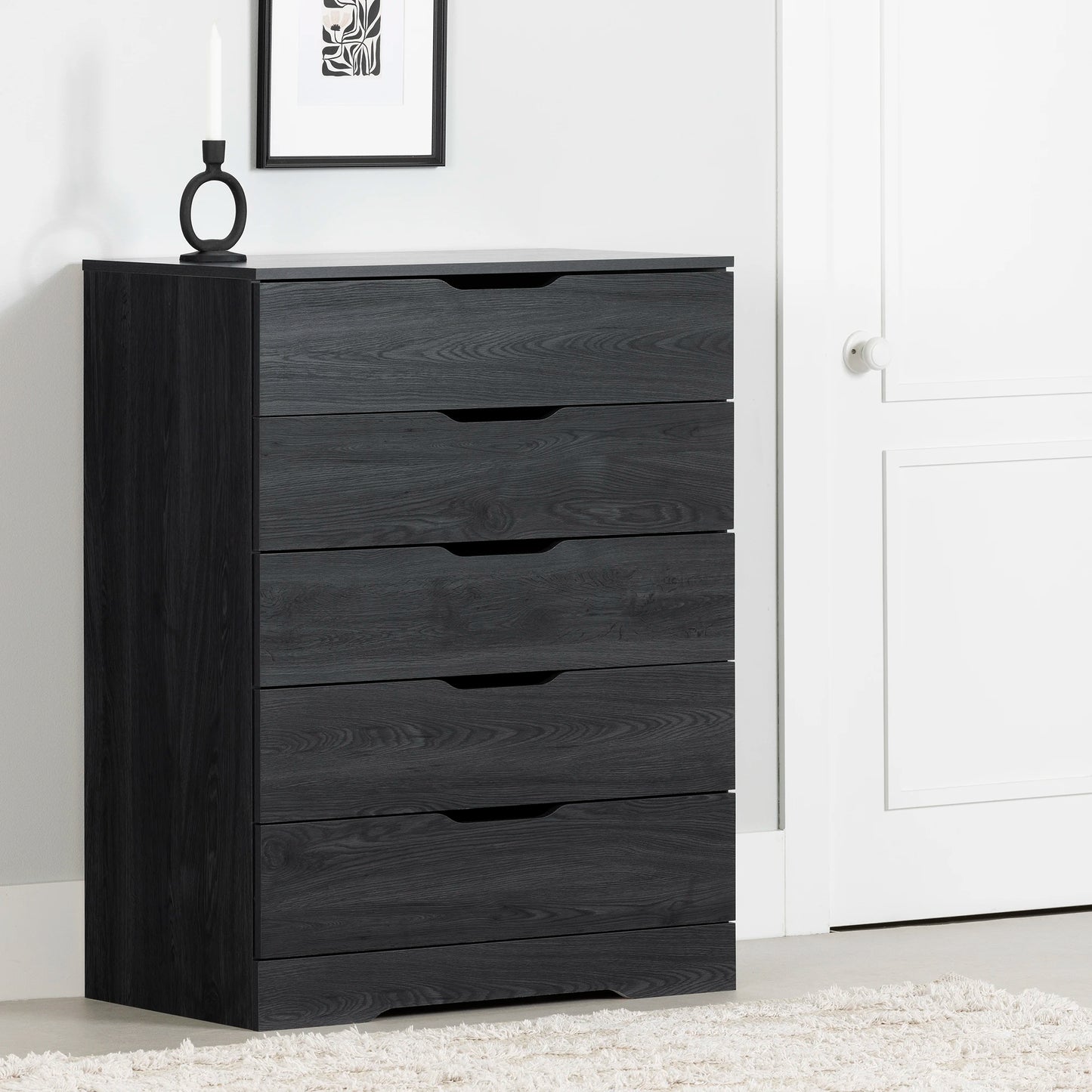 Cette commode aux lignes droites et épurées comprend cinq tiroirs munis de coulisses de métal qui glissent en douceur et offrent un rangement vertical pratique. De plus, les tiroirs sont dotés de poignées découpées d'inspiration contemporaine.