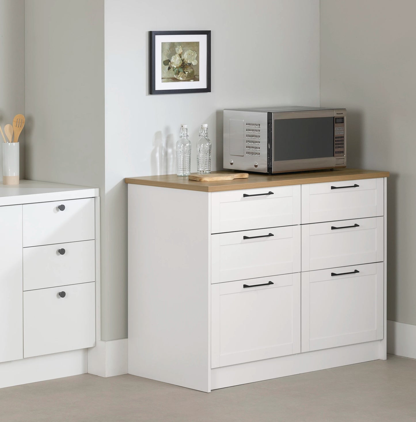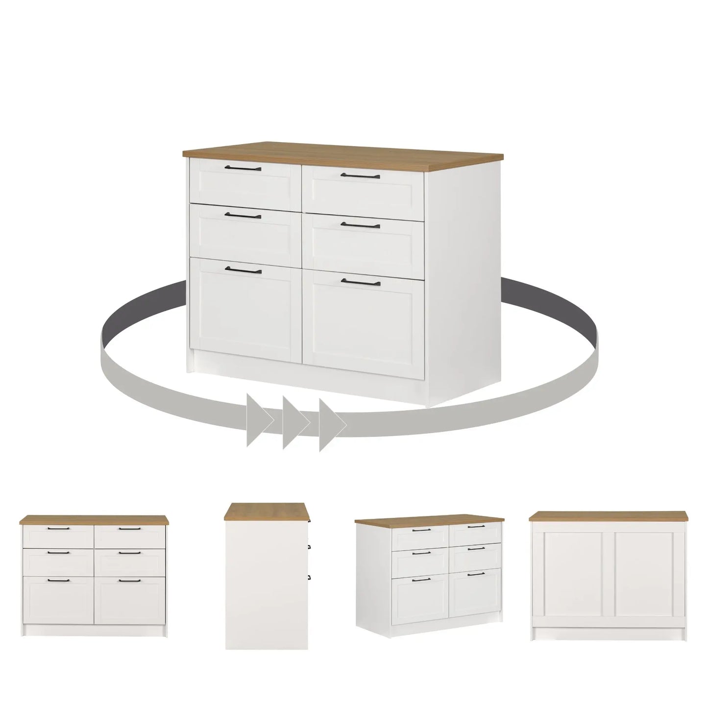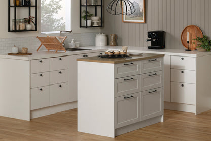 L’îlot, empreint d’un charme rustique, réchauffe l’atmosphère avec son style farmhouse. Les finitions délicates, telles que les poignées en métal et les tiroirs de style shaker, contribuent à son allure authentique et élégante. Flexible, il peut être positionné au cœur de votre cuisine ou contre le mur, s’adaptant à vos besoins et envies.