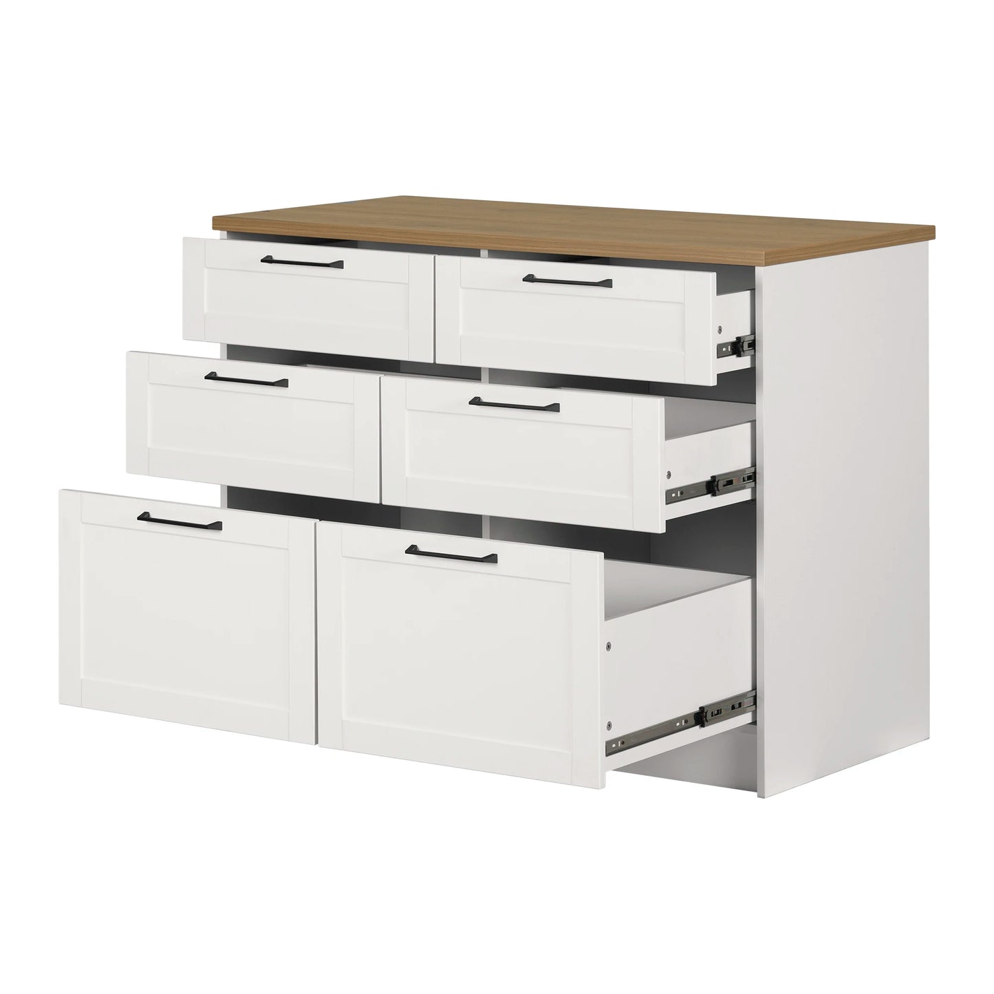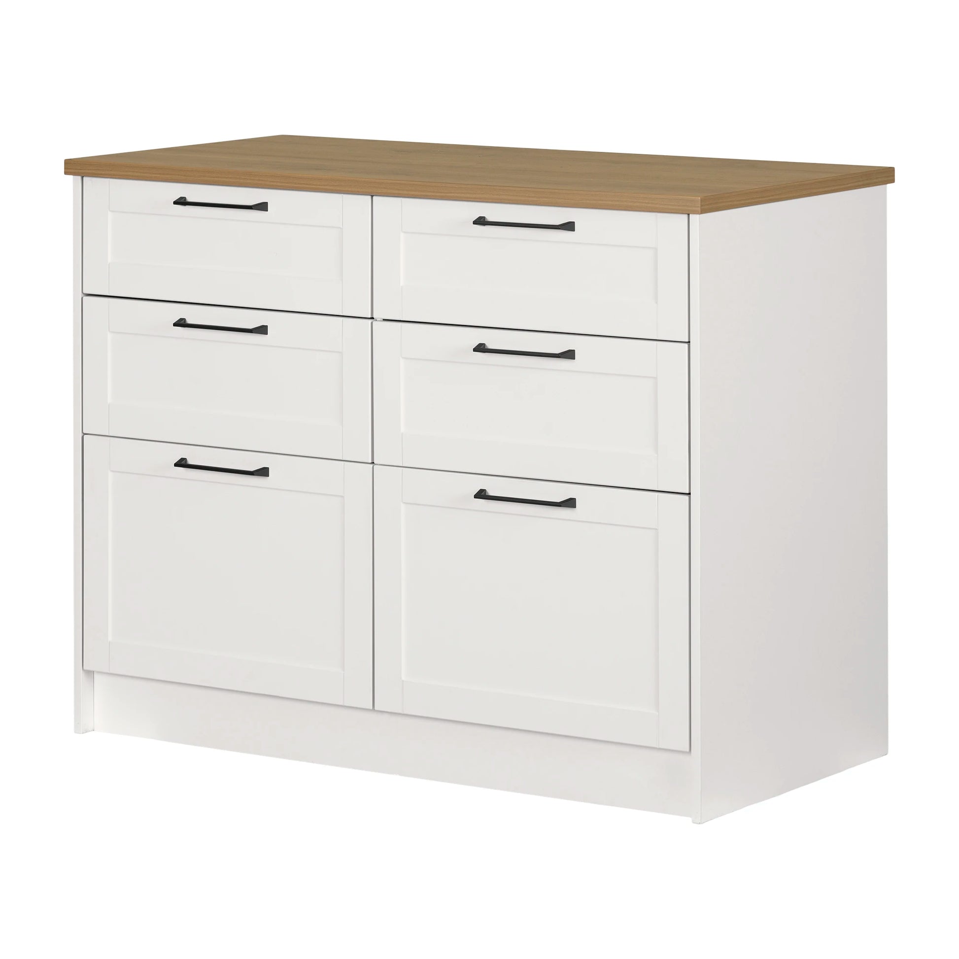 Cet îlot est conçu pour être l’allié parfait dans votre cuisine, combinant utilité et élégance. Six tiroirs stratégiquement dimensionnés s’offrent à vous : le premier pour vos ustensiles, le deuxième pour des contenants variés et le dernier, plus spacieux, pour les chaudrons. Grâce à des caractéristiques pensées pour votre confort, comme des coulisses pleine extension et un mécanisme de fermeture en douceur, l’utilisation des tiroirs est un vrai plaisir. La surface de travail en mélamine, non seulement résistante aux égratignures et à l’eau, offre un plan de travail robuste et facile d’entretien pour vos activités culinaires.