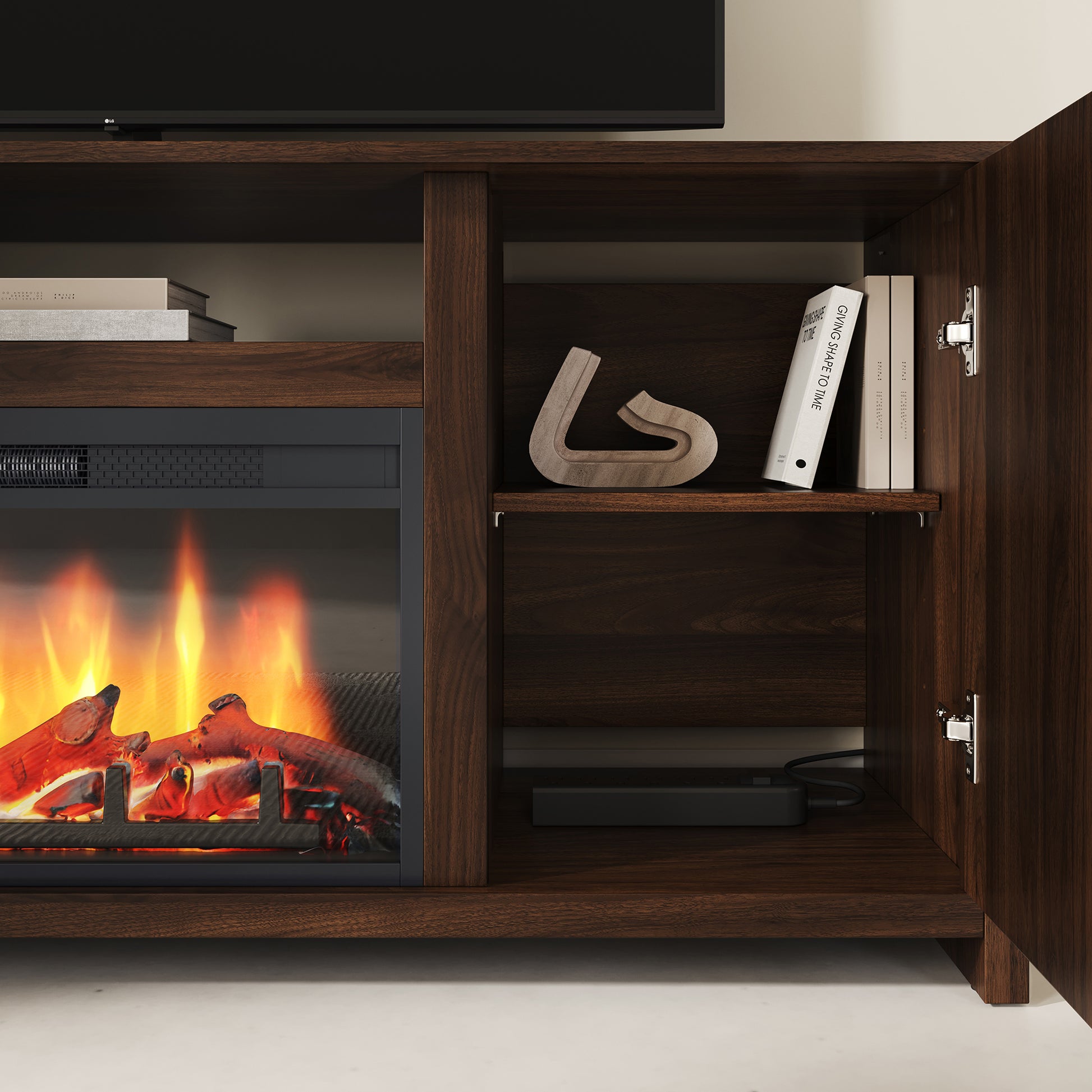 Le foyer électrique intégré ajoute une touche de confort incomparable à votre pièce. Facile à utiliser, il est contrôlé à l’aide d’une télécommande, vous permettant d’ajuster l’ambiance en toute simplicité, sans quitter votre fauteuil. Que ce soit pour réchauffer l’atmosphère ou simplement profiter de l’effet visuel des flammes, ce meuble devient rapidement le point central de votre salon.