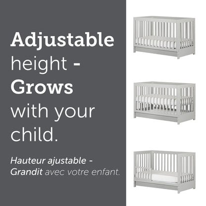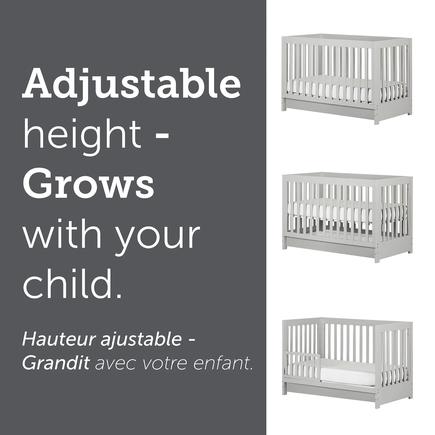 • A FOUR LEVEL “EVOLVING” BED: This crib can be adjusted to four heights, to keep pace with your kid’s growth. A toddler rail is also included.