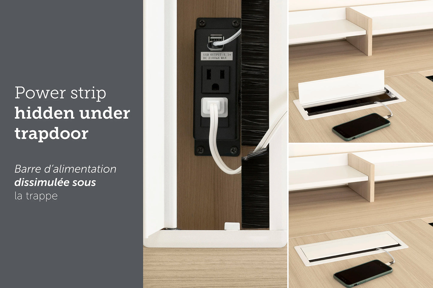 • HIDDEN POWER BAR: a power strip with two USB ports and two regular outlets is hidden under a trapdoor on the surface, for a more discreet look and an optimal functionality.