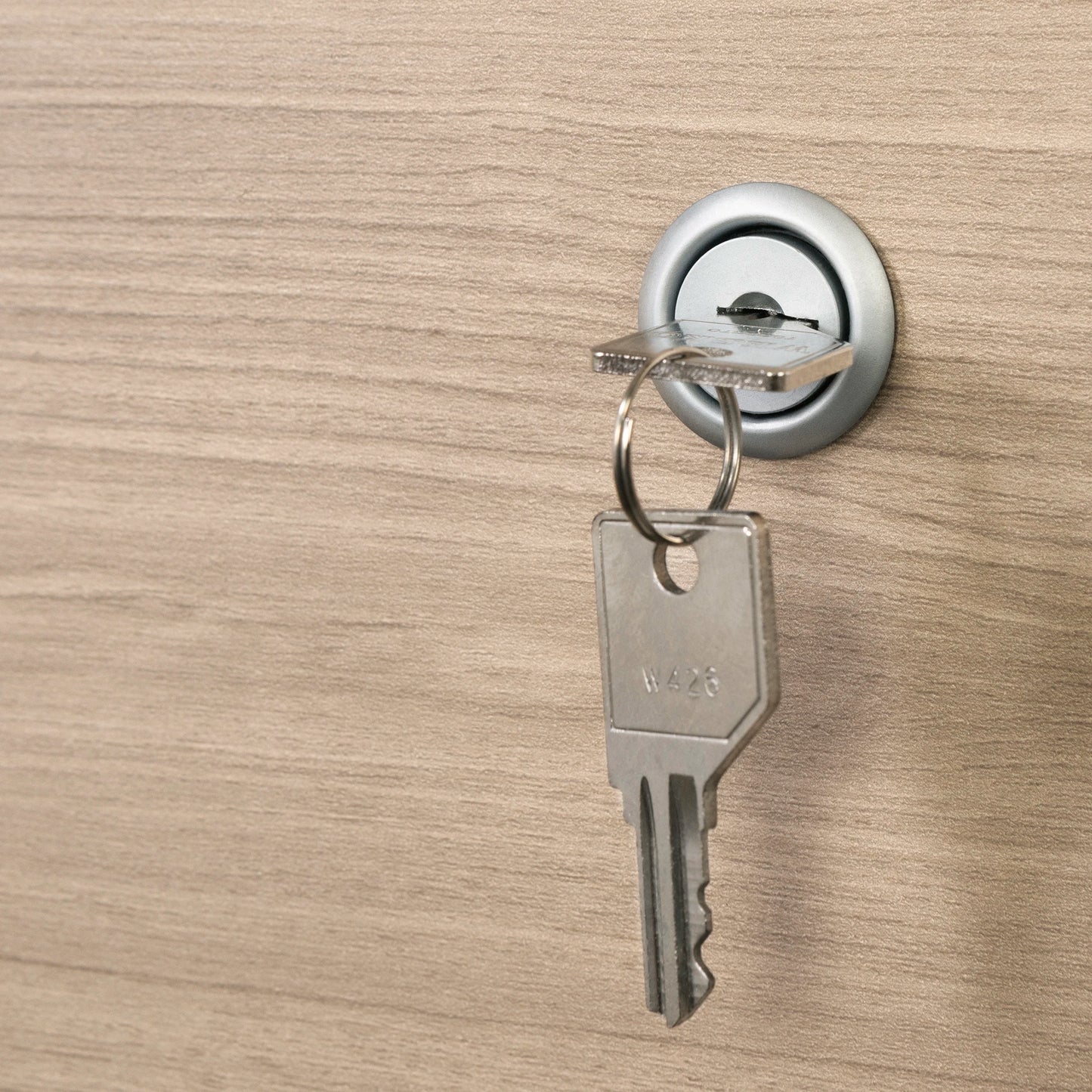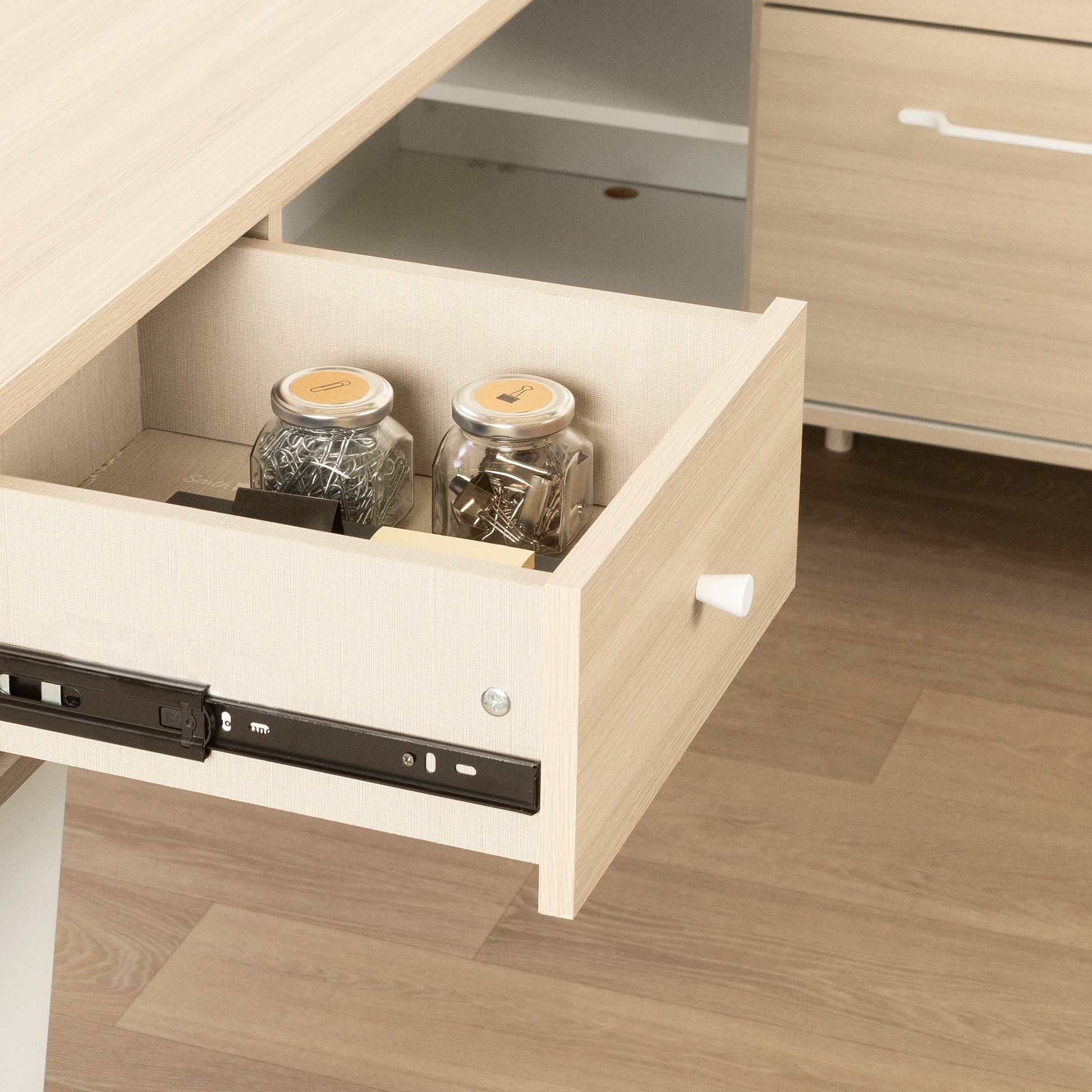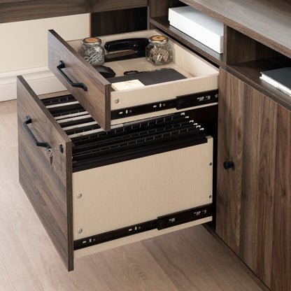 • OPEN AND CLOSED STORAGE SPACE: this corner desk comes with two small drawers and one large file drawer (for 8½”x11”or 8½”x14” files) that locks with a key. It also has a door that conceals two fixed shelves and an adjustable one. The final touch: we added four open spaces for better access. All of the drawers are mounted on metal slides, which makes them even more resistant.