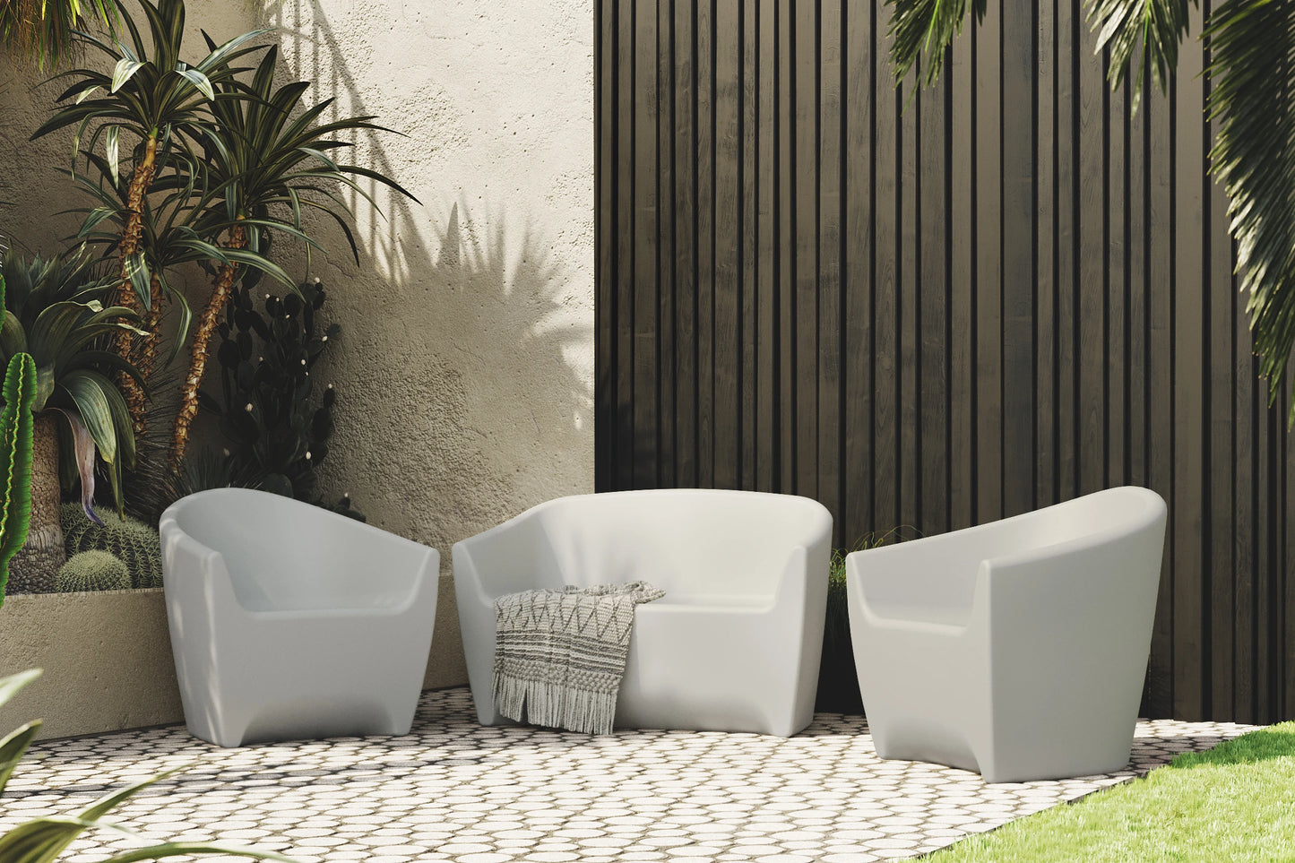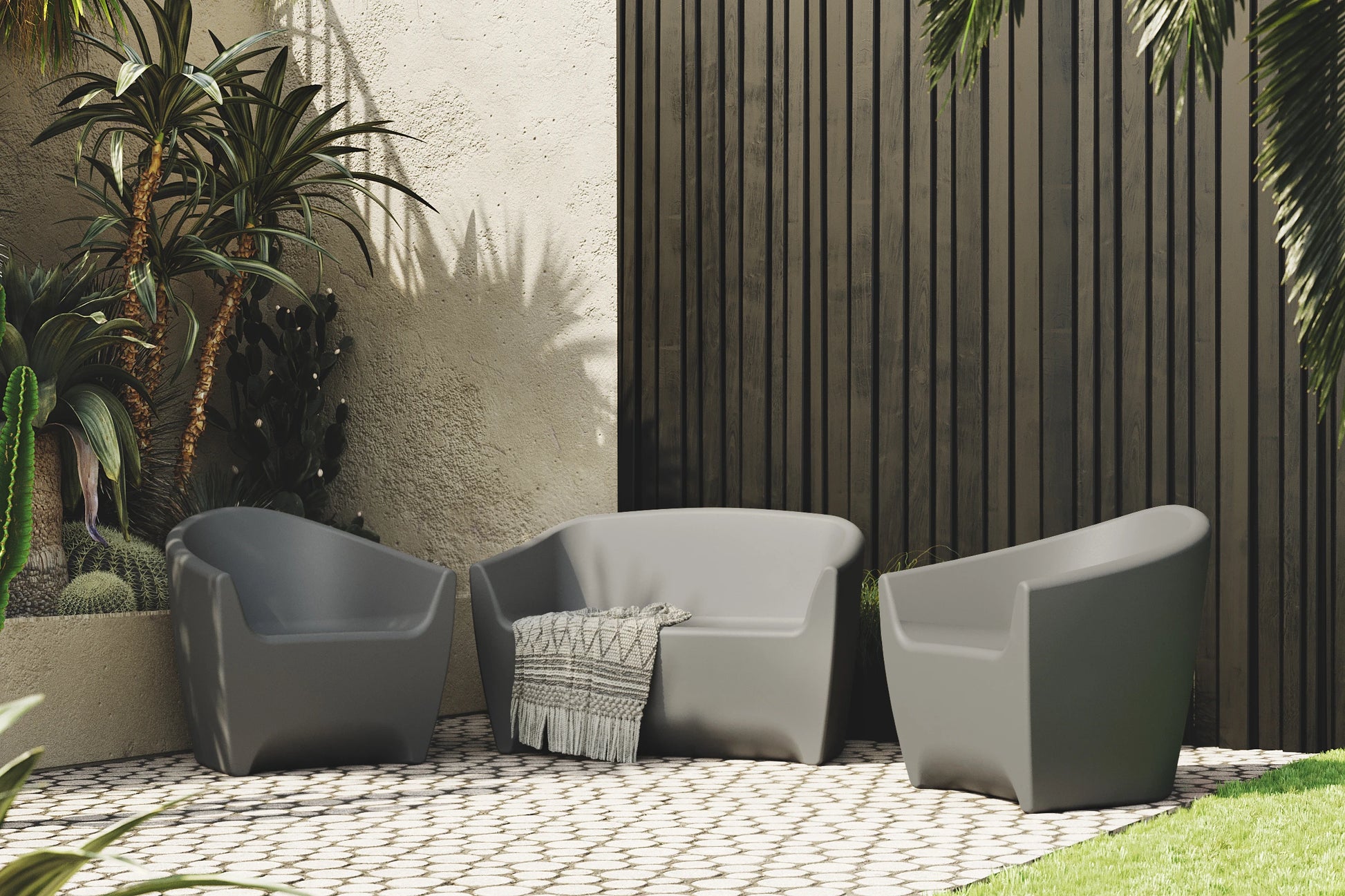 Whether you're an individual or a business, this patio set including 2 armchairs and 1 loveseat in marine-grade polyethylene is sure to win you over. Installed on a terrace, poolside or in a garden, all pieces are designed to withstand the elements. Water, humidity, sun and cold will not cause their deterioration. Every piece of furniture will maintain its beautiful appearance all year round. For greater wind resistance, insert pebbles or sand in their base. This will prevent them from blowing away!