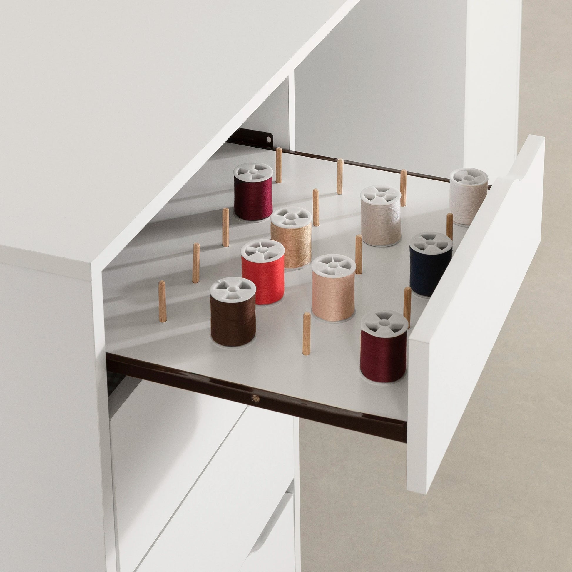 • THREE DRAWERS AND A SHELF: We’ve added three very handy large drawers on metal slides, where you can keep your fabrics and small tools. You also have a slide out shelf with removable dowels for sorting and storing your thread.